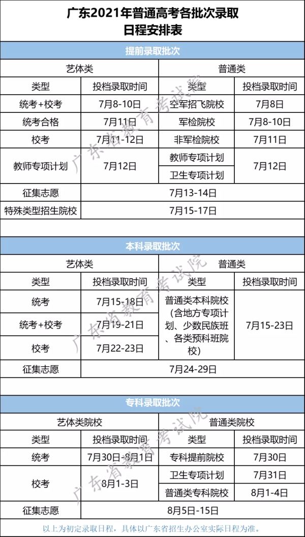 从广东省教育考试院获悉,广东省2021年普通高校招生录取将于7月8日-8月15日举行。其中,提前批为7月8-17日;本科批为7月15-29日;专科批为7月30日-8月15日。
