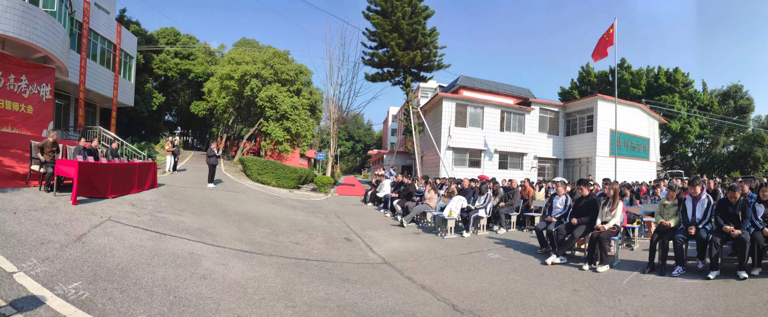 誓师大会在雄壮的国歌声中拉开序幕,鲜艳的五星红旗冉冉升起,每个人的眼中都升腾起炽热的亮光,充满着青春的力量,励志成为新时代的有志青年,为祖国的繁荣富强贡献自己的力量。