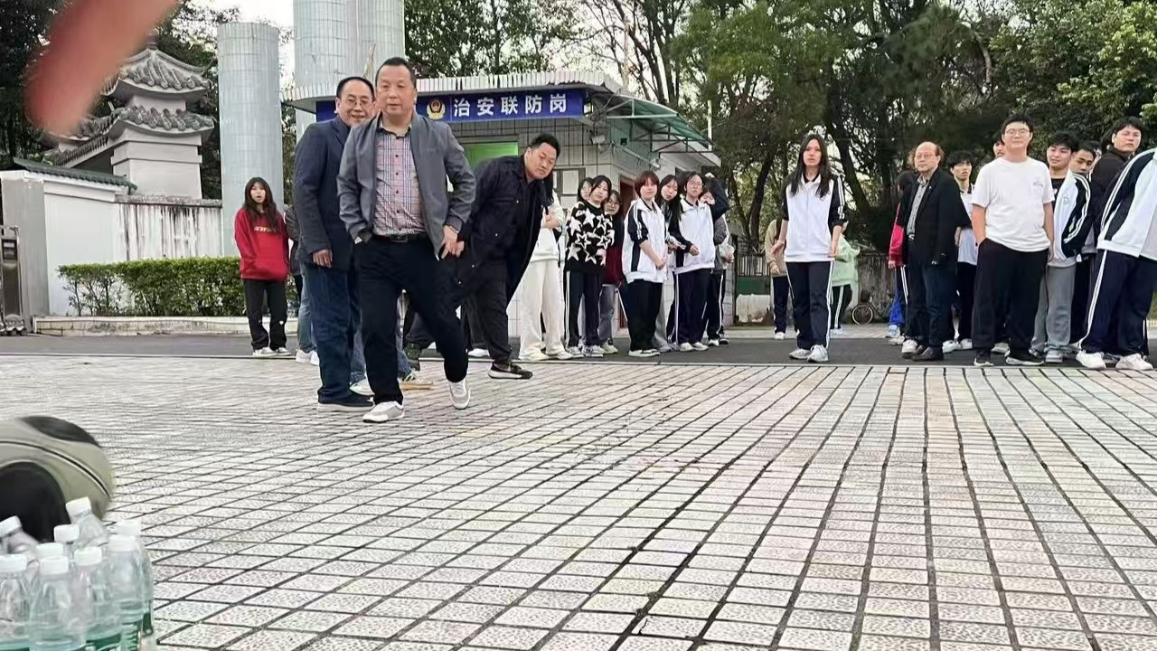 在“保龄球”比赛场地,老师们就地取材,用蓝球和矿泉水瓶作道具,每人两次机会,击倒10米远的“保龄球”。参赛同学不断观察,充分发挥钻研精神总结出获胜的法宝,欢声笑语此起彼伏,充满整个球场。